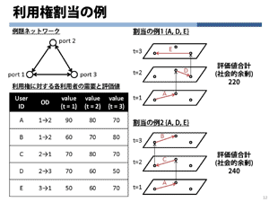 その仕組みですが、最初に各利用者にランダムに「何月何日の何時に使えるよ」という利用権を配布しました。それを使ってもいいのですが、不要なものは利用権市場に「売りに出しますよ」みたいな形で売りに出してもらって、もし他の人が欲しければ買いますよ、誰にも売れなかったら結局自分のところにもどってきますよという形で仕組みを作りました。それにより、売買が上手く行われれば、最適な割当が自動的に行えるという仮定を置いたのです。 |