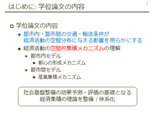 私の学位論文のタイトルは、「人口・産業の空間的集積パターンの自己組織化メカニズム:都市内・都市間 集積経済モデルの分岐特性」です。 今日は、緊張しておりますが、少しでも内容を理解してもらえるよう、熱意を持って説明したいと思っております。 最初に、学位論文の内容についてご説明いたします。 この研究の目的は、都市内・都市間の交通・輸送条件が経済活動の空間分布に与える影響を明らかにすることです。そのために、経済活動が空間的に集積するメカニズムの理解を試みています。具体的には、扱う空間スケールの大きさごとに、都市内モデルにより都心の形成メカニズムを、都市間モデルにより産業の集積メカニズムを明らかにしようとしています。そして、これらを通じて、社会基盤整備の効果予測や評価の基礎となる経済集積の理論の整備・体系化を目指しています。 |