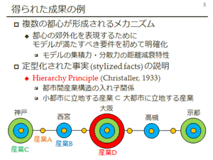 ここで、得られた成果を2つご紹介したいと思います。 その一つは、複数の都心が形成されるメカニズムを明らかにしたことです。実は、都心形成現象を説明する理論は都市経済学分野で1980年代から研究されているのですが、複数の都心が出来る明確なメカニズムは不明なままとなっていました。複数の都心が形成するメカニズムの解明は、都心の郊外化を表現できるモデルを構築する上で不可欠であることを考えると、土木計画学分野においても重要な研究課題といえます。私の学位論文では、都心の郊外化を表現する(複数の都心が形成する)ためにモデルが満たすべき要件を始めて明確化することに成功しました。そのメカニズムを具体的に説明する時間がないため、ここでは省略させていただきますが、モデルが持つ人や企業を空間的に集める集積力や、人や企業を反発させる分散力の距離減衰特性が複数都心を生む重要な鍵となることを明らかにしたことは、本研究の重要な成果です。 もう一つの成果は、定型化された事実(stylized fact)の一つを説明することに成功したことです。具体的には、階層原理(Hierarchy Principle)と整合的な空間集積パターンが創発するメカニズムを明らかにしました。この階層原理とは、都市間の産業構造の入れ子関係を表すもので、小都市に立地する産業集合が大都市に立地する産業の部分集合となる性質を意味するものです。この規則性は、1930年代に発見され現在でも成立し続けている、都市に関する重要な規則性の一つであり、この規則性が自己組織的に形成されるメカニズムを解明したことも、本研究の特徴となっています。 |