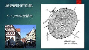 ドイツに行きますと、中世のまちというのは、ほとんどが街の真ん中が歩行者天国になっており、歩行者用の道路として造られております。しかし、私が行った1973年、1974年ぐらいは、まだ走りでありました。これはネルトリンゲンという場所ですが、だいたいドイツの街というのは、真ん中に教会と市庁舎があって、そこに周りから街道が集中していて、ちょうど交差点のようなかたちになっています。 |
